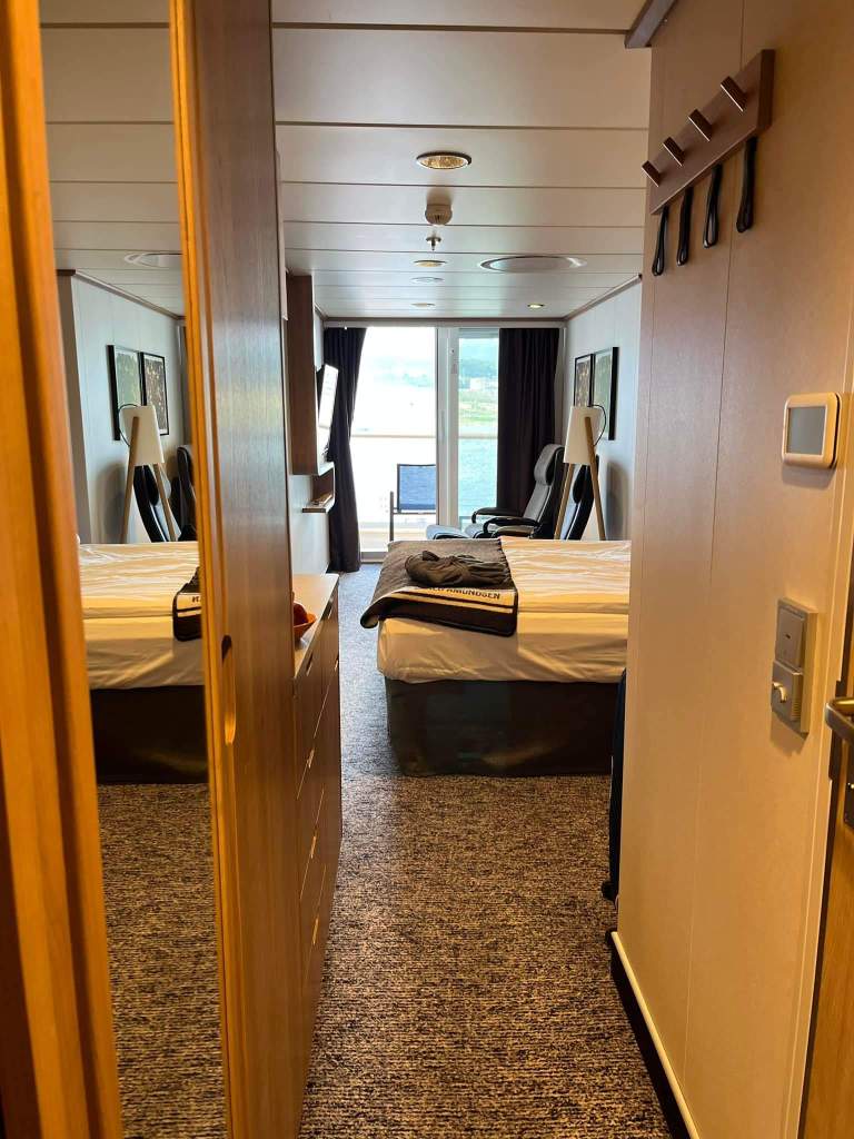 Having packed the most important stuff carry-on I literally shoved my unopened case under the bed – tomorrow’s problem. I have two days at sea to unpack.