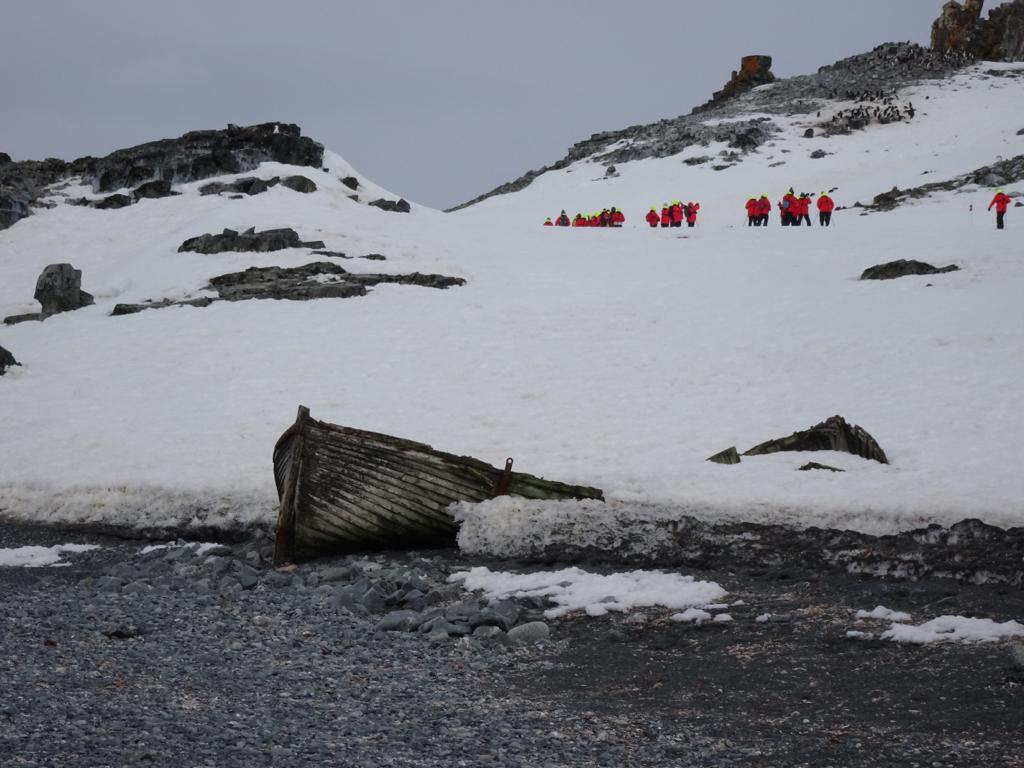 Expedition team (and penguins) prepping for our visit – view from the ship.