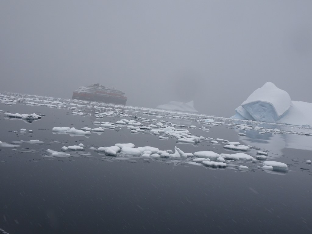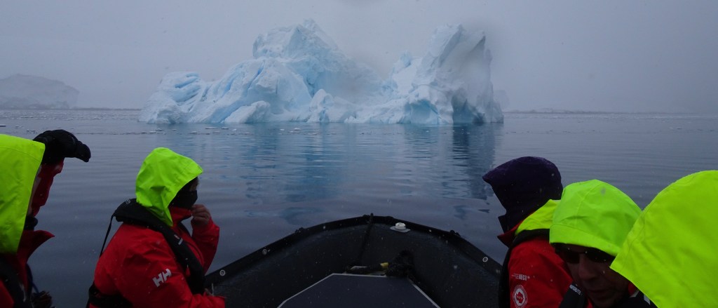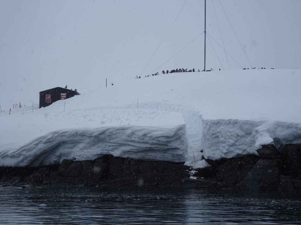 The zodiac ride was snowy and atmospheric as it was very foggy. We could barely see the station or the penguins. The navy ship lending assistance to the team floated like a ghost ship in the bay. There was a nearby iceberg that looked like the Sydney Opera House – eerie.